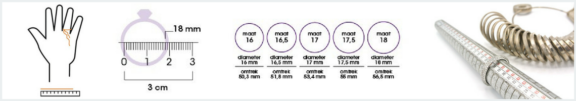Kom je bij het opmeten van het aantal millimeters niet uit op een standaard maat zoals aangegeven staat in de ringmaten tabel, kies dan voor de dichtstbijzijnde (grotere) maat.